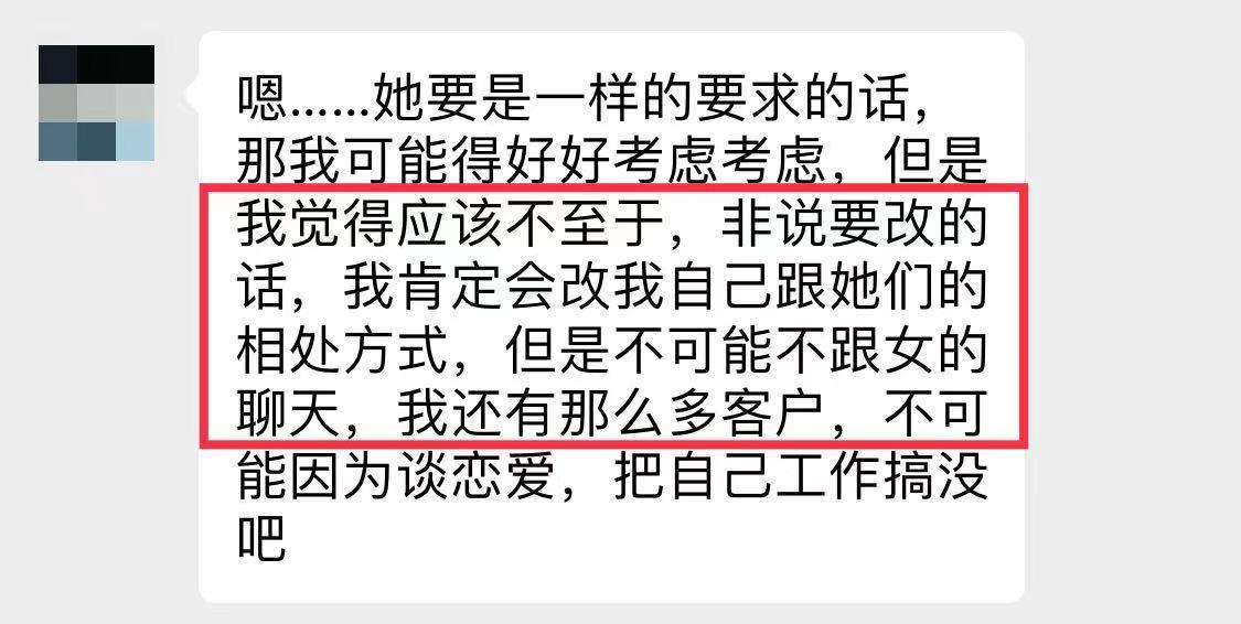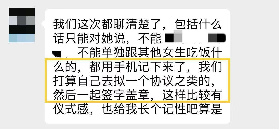 比如,跟其他异性之间的聊天内容,不能过于暧昧,有哪些话语是只能跟自己的伴侣之间说的,又或是避免跟其他异性单独见面等细节内容。