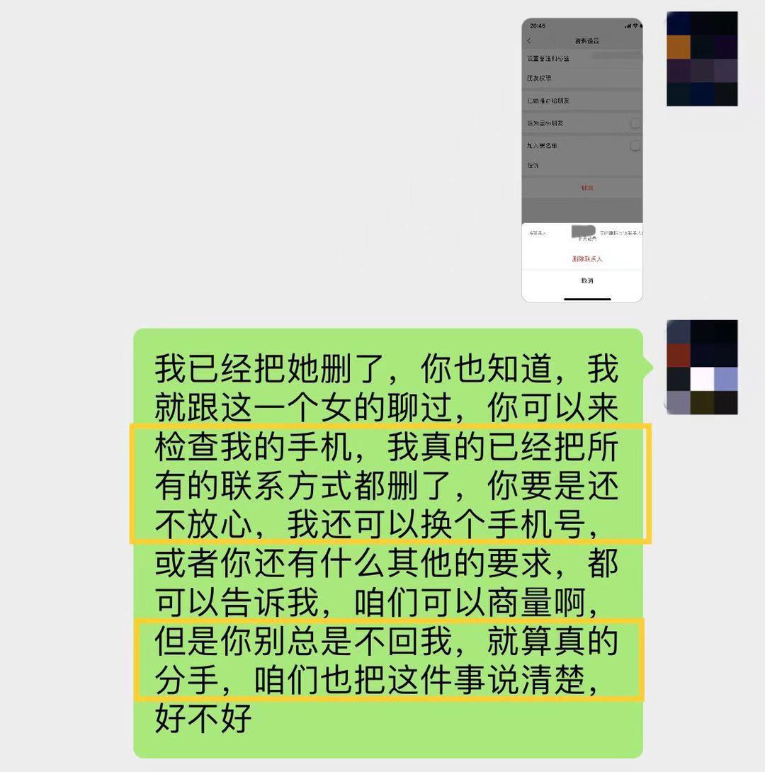 比如,像案例中一样,跟女主播这种,在你的生活中可有可无的人的联系,你就可以把"拉黑/删除第三方"的截图,发给对方,让她首先看到你想要做出改变、退让的决心。
