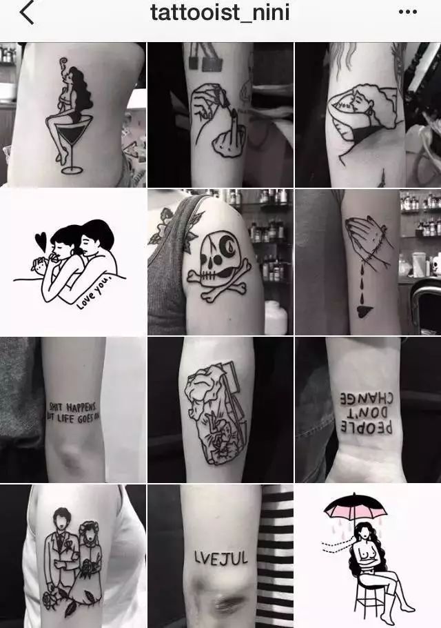 不管是纯图案或是文字形式的刺青,在Nini的描绘下总是能表现的很有质感,即便是一个相当简约的图型,也能表现出可爱、幽默甚至蕴含深意的表现。