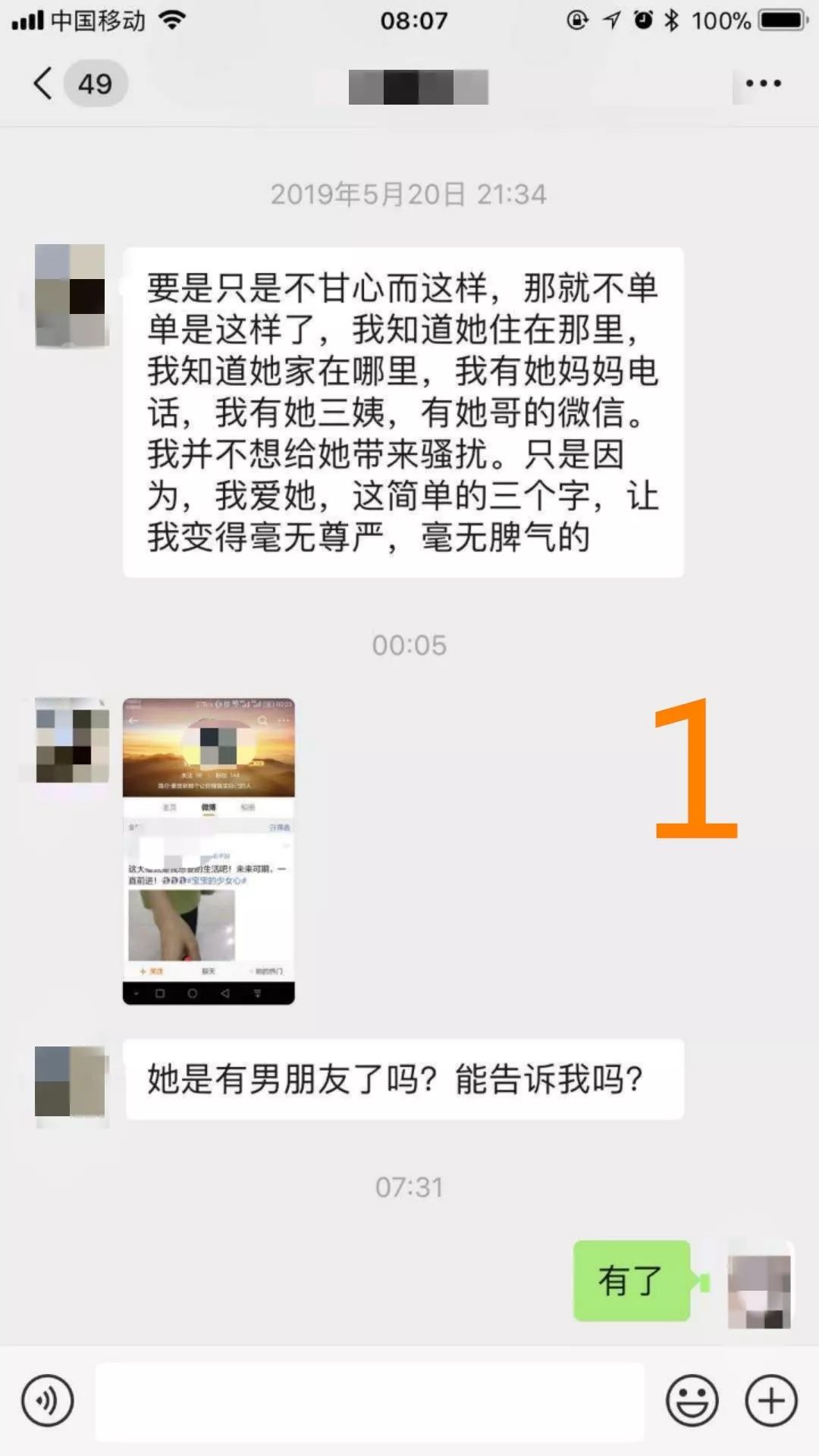 目前遇到的困境是:他知道我身边目前有追求者就开始发疯,找我的朋友说要报复我,不怕我报警,以前就在我家楼下堵过我,还去公司装应聘,保安放进来就找我,觉得这个人很kb,遇到这样的情况我不知道应该怎么办?微信删除了,没有聊天记录,附上他跟我朋友的对话。